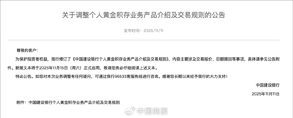 同日,中国建设银行也发布公告称,为保护投资者权益,该行修订了《中国建设银行个人黄金积存业务产品介绍及交易规则》,内容主要涉及交易报价、巨额赎回等事项。新版文本将于11月15日正式启用。其中,有关黄金积存计划的日积存起点金额由此前的1000元上调为1200元。