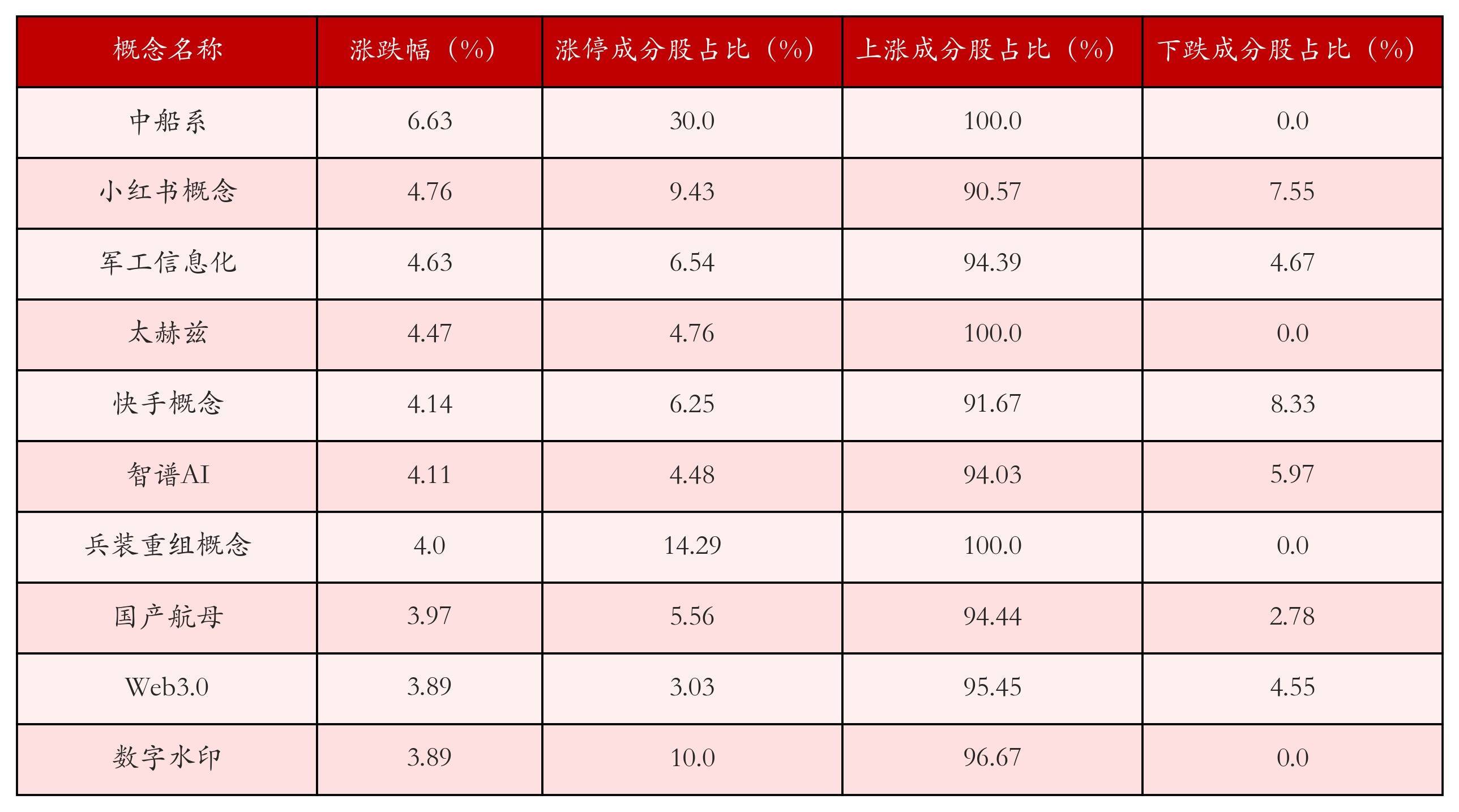 根据A股概念涨跌幅与所对应的股票池综合分析,涨幅靠前的三个概念板块分别为:中船系、小红书概念与军工信息化。排名前10位的概念板块相关数据见下表: