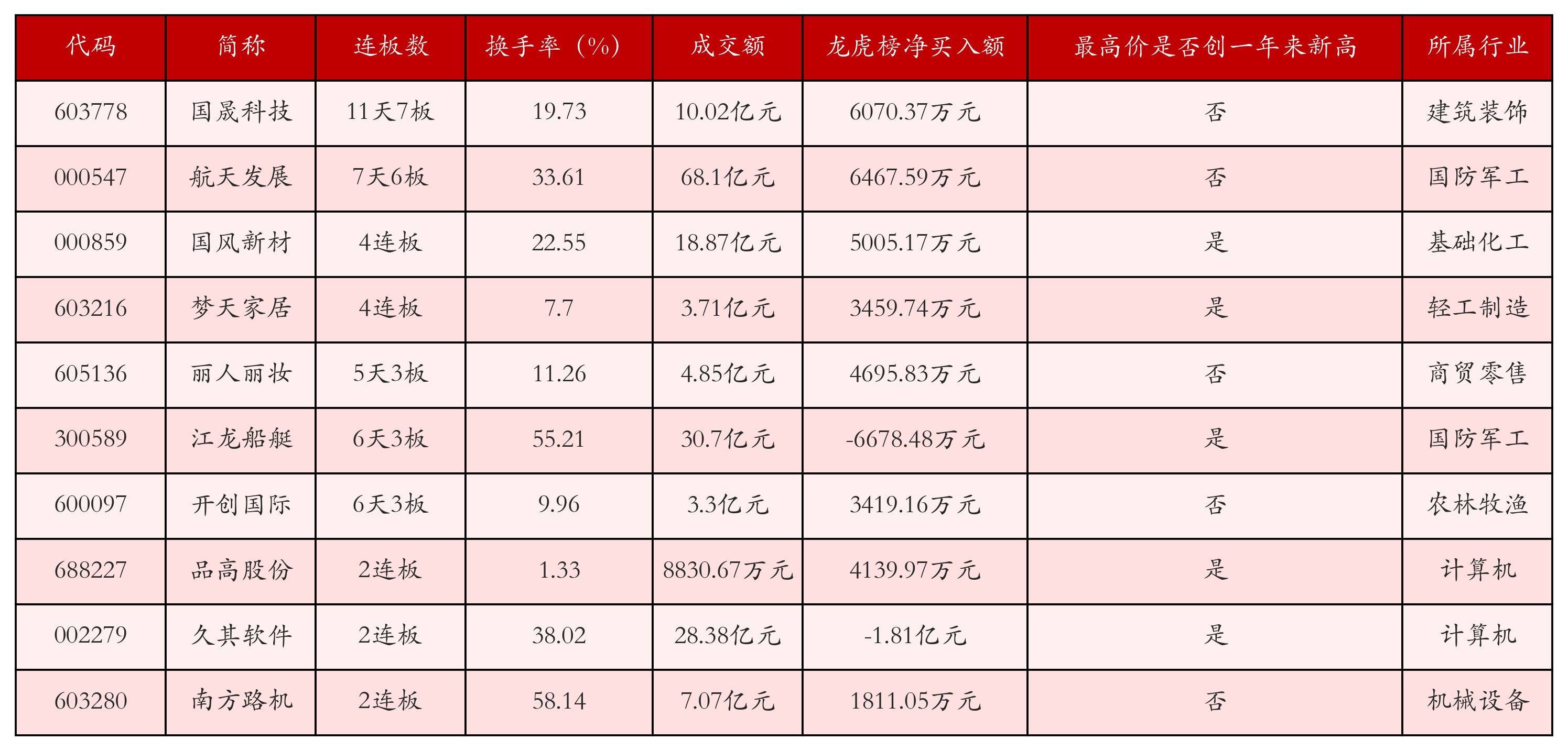 截至11月24日收盘,上证综指上涨0.05%,收于3836.77点,深证成指上涨0.37%股票配资的论坛,收于12585.08点,创业板指上涨0.31%,收于2929.04点。今日沪深两市A股共计79只涨停,综合当前连板数以及当日龙虎榜数据,其中较为强势的前三只个股分别为:国晟科技(603778)、航天发展(000547)与国风新材(000859)。今日强势个股前10位具体数据见下表: