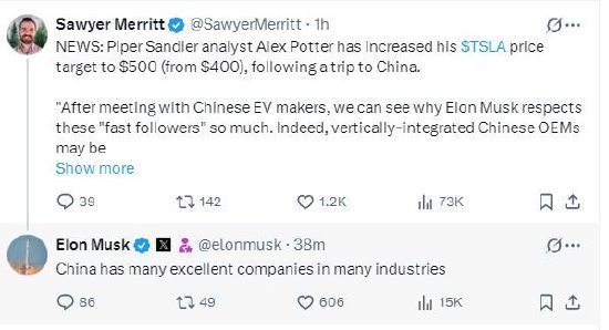 马斯克回应称:“中国在很多行业都有很多优秀的公司。”